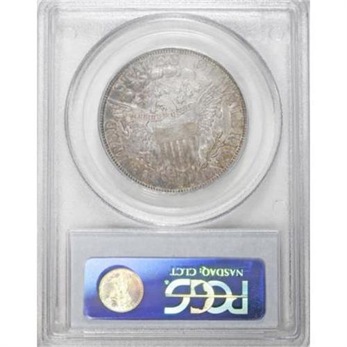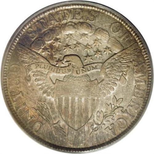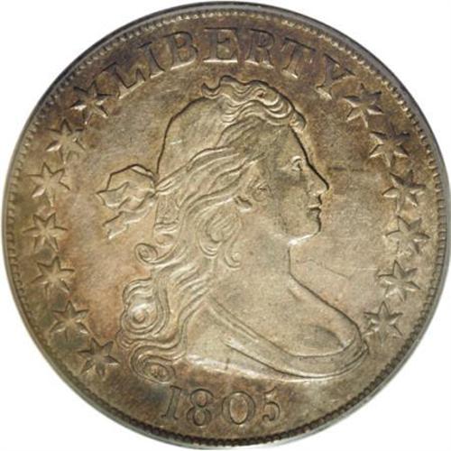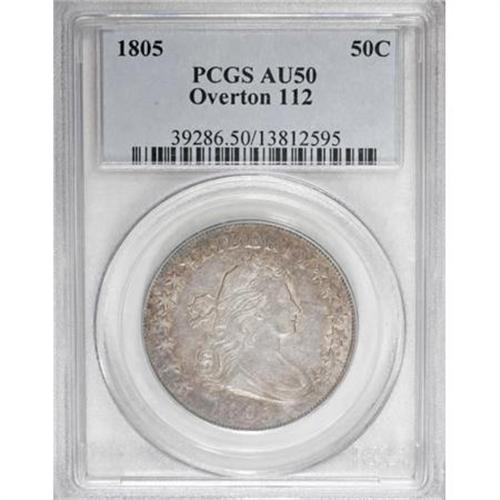 <B>1805 50C AU50 PCGS.</B></I> O-112, R.2. Like O-111, this is another use of Obverse 7 with a single-use reverse. This Large 5, five berries combination is unlike several of the previous reverses seen from this year, as this reverse has a normal F and the A's do not have a broken bottom serif. <BR> This is the usual die state with light clash marks and minor die cracks, neither particularly advanced.<BR> Sharply detailed with excellent luster on both sides. Light gray and gold color covers the obverse and reverse with deeper steel-blue and iridescent toning. The reverse has crossing adjustment marks through the clouds and stars.<BR> A couple of near-Mint examples are known of the O-112, and several other pieces have been offered at auction in the various AU grades. At the AU50 level, this piece is currently tied with one other at the bottom of the Condition Census. <BR> Haseltine-11; Beistle 5-F; Overton-20; PCGS# 39286; Encyclopedia-4577.<BR> <I>Ex: Gerald Shertz; Sheridan Downey (9/1997).<BR>From The Westmoreland County Collection of Early Bust Halves, 1794-1807.</B></I><BR><BR><B>Coin Engraver:</B> Robert Scot<BR><BR><b>Shipping:</b> Coins & Currency (<a target="_blank" href="http://www.heritageauctions.com/common/shipping.php">view shipping information</a>)