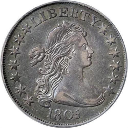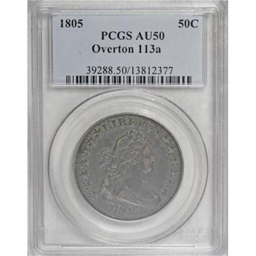 <B>1805 50C AU50 PCGS.</B></I> O-113a, High R.4. The ‘non-a' O-113 does not exist even though it is still included in the fourth edition of Overton. The difference between O-113 and 113a is listed as 12 arrows on the reverse of 113 and 13 arrows on the reverse of 113a. This listing seems illogical since one would expect die wear or die polishing would remove arrows, not add them. Like O-111 and 112, this is another single-use reverse that is paired with Obverse 7. <BR> This coin is an intermediate die state with a light crack through the tops of MERI.<BR> Deep steel toning with splashes of dark gold on the highpoints, mask the considerable luster that is still present on both sides of this piece.<BR> There are no AU50 coins listed on Herrman's <I>Auction & Mail Bid Prices Realized.</B></I> However, there is one AU58/58 coin listed, and six AU55/55 pieces. Given the number of AU pieces recorded, one may deduce that a relatively large number of this variety was set aside shortly after production. Nevertheless, there are few pieces in absolute terms.<BR> Haseltine-12; Beistle 5b-H; Overton-23; PCGS# 39288; Encyclopedia-4578.<BR><I>Ex: Robert Zornes (4/2000).<BR>From The Westmoreland County Collection of Early Bust Halves, 1794-1807.</B></I><BR><BR><B>Coin Engraver:</B> Robert Scot<BR><BR><b>Shipping:</b> Coins & Currency (<a target="_blank" href="http://www.heritageauctions.com/common/shipping.php">view shipping information</a>)