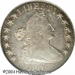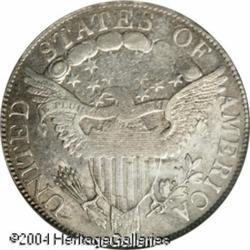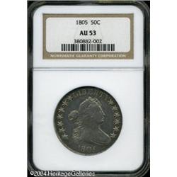 1805 50C AU53 NGC. O-109a, R.3. Mint-made die crac <B>1805 50C AU53 NGC.</B></I> O-109a, R.3. Mint-made die cracks through the arrow shafts and shield identify the Overton marriage. Chestnut-gray and apple-green colors enrich this attractive example. Unmarked except for a minor pinscratch below the right side clouds and a trivial obverse rim ding at 8 o'clock. The strike is not full on the eagle's head and the stars above, a characteristic of the issue. Most 1805 Halves are in Fine to XF grades. Examples with substantial mint luster are rare. Population: 8 in 53, 16 finer (11/04). <BR><BR><B>Important notice:</B> Heritage usually auctions material at the rate of 200-250 lots per hour. On some occasions eBay Live bid software or the Internet may not be able to keep up with the pace of the auction. We recommend placing a realistic absentee bid now as insurance to avoid disappointment. Occasionally the auctioneer may eliminate or reject an eBay Live bid, and the auctioneer may also reopen a lot after the close of the eBay live bidding (usually because we missed an audience bid), and may reject your bid even if it shows you as the winning bidder. By bidding via eBay Live, you agree that Heritage may award the lot to another bidder at its sole discretion under the circumstances described above or any other reasonable circumstances. Since eBay bids are not shown to us until we open the lot on the floor, we treat those bids just like floor bids. In most cases the floor responds before the eBay bid is presented to us, due to Internet lag time, so for consistency we have made it a policy that floor bids are always considered first over tie eBay live bids. Also please note that all Heritage lots purchased through eBay Live carry a 20% Buyer's Premium. Please make sure you read the Terms and Conditions before you bid. This lot is being auctioned in conjunction with a live floor auction by Heritage Galleries & Auctioneers. All final auction and invoice information will be supplied by Heritage Galleries & Auctioneers, and all other information should be considered preliminary. Lot:6038