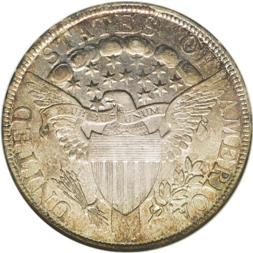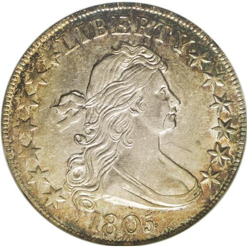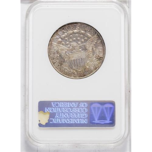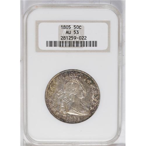 <B>1805<50C> AU53 NGC.</B></I> O-112, R.2. Star 9 is recut, and the 1 in the date is quite close to the curl. The 80 is large, and the 5 is slender, with a well curved top. The reverse has five berries, with a short stem on the lowest one. A die crack runs from the first S, across the clouds, to the last S. This lustrous example has champagne-gold patina that deepens near the rims to copper-gold. Light rub is visible on the highpoints, but otherwise the piece is largely distraction-free. Bold clash marks are seen in front of the bust from the shield point.<BR><I>From The Chief Paduke Collection.</B></I>