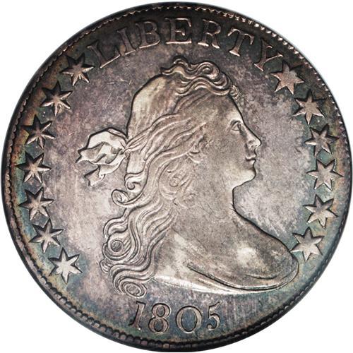<B>1805 50C AU55 NGC.</B></I> O-108, High R.4. Aquamarine and lilac toning embraces this partly lustrous representative. Crisply struck save for softness above the eagle's right (facing) wing. A few moderate marks are found upon examination beneath a loupe. A scarcer die marriage. Census: 9 in 55, 10 finer (11/06).<BR><BR><b>Shipping:</b> Coin/Currency (<a target="_blank" href="http://www.heritageauctions.com/common/shipping.php">view shipping information</a>)