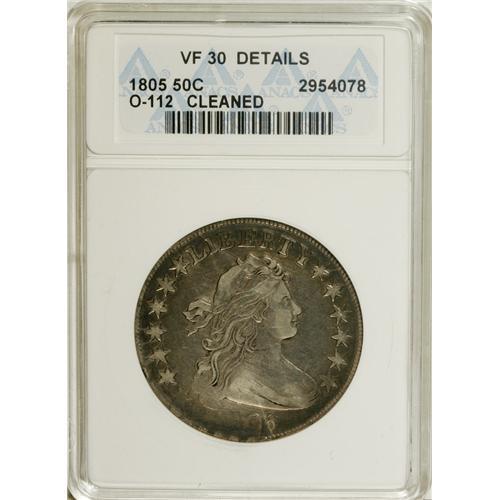 <B>1805 50C --Cleaned--ANACS. VF30 Details.</B></I> O-112'a', listed as "R.7?" by Herrman. This coin was struck from an advanced state of the die, as the diagnostic circular die crack through STATES and the upper portion of the clouds has developed into a retained cud. The retained cud on the reverse is the cause for unusual weakness on the 18 in the date and the lowest hair curl. The late die state was not described by Overton, and is considered R.7. A sharp but hairlined example with light corrosion on Liberty's upper neck.<BR><I>From The Hoosier Discovery Collection.</B></I><BR><BR><b>Shipping:</b> Coins & Currency (<a target="_blank" href="http://www.heritageauctions.com/common/shipping.php">view shipping information</a>)