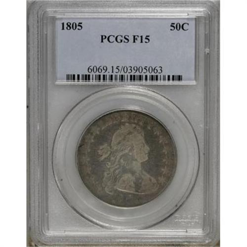 <B>1805 50C F15 PCGS.</B></I> PCGS Population (22/229). NGC Census: (17/205). Mintage: 211,722. Numismedia Wsl. Price for NGC/PCGS coin in F15: $353. (#6069)<BR><BR><B>Coin Engraver:</B> Robert Scot<BR><BR><b>Shipping:</b> Coins & Currency (<a target="_blank" href="http://www.heritageauctions.com/common/shipping.php">view shipping information</a>)