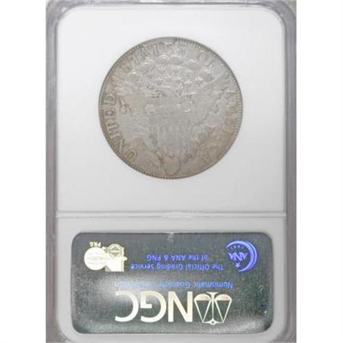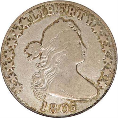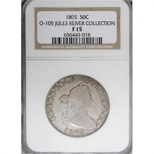 <B>1805 50C Fine 15 NGC.</B></I> O-105, R.5. After the breakup of Obverse 3, the next Wide Date 1805 half used a new obverse that is characterized by the stars large and close together. But it differs from the O-104 by the position of the final two digits in the date, which are closer to each other than previously seen. <BR> This variety has the same reverse as that used on O-103 and O-104, and on O-105 it begins its final breakup, with a heavy rim break above the ATE of STATES that engulfs the tops of TE. In the more advanced state of the die (O-105a), a heavy break will develop at the top of ITE in UNITED, although it is not present on this example. <BR> This example exhibits light gray patina with reddish-gold accents that cling to portions of the design elements. Nice definition for the grade, and the surfaces are relatively clean.<BR> Haseltine-9; Not in Beistle; Overton-12; PCGS# 39278; Encyclopedia-4581.<BR><I>Ex: Julian Leidman (10/1979); Jules Reiver Collection (Heritage, 1/2006), lot 22529.<BR>From The Westmoreland County Collection of Early Bust Halves, 1794-1807.</B></I><BR><BR><B>Coin Engraver:</B> Robert Scot<BR><BR><b>Shipping:</b> Coins & Currency (<a target="_blank" href="http://www.heritageauctions.com/common/shipping.php">view shipping information</a>)