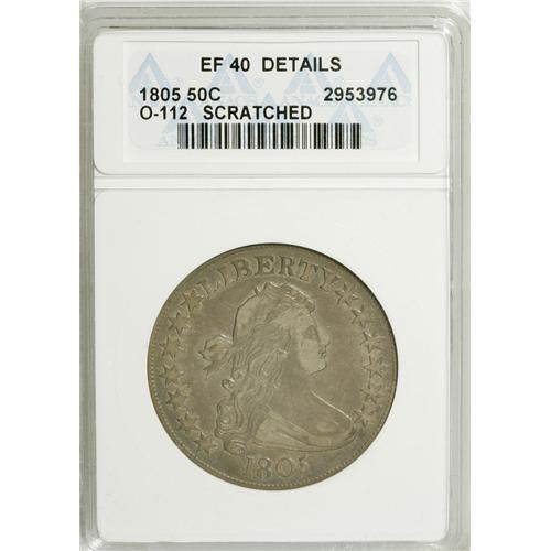 <B>1805 50C --Scratched--ANACS. XF40 Details.</B></I> O-112. NGC Census: (32/84). PCGS Population (47/53). Mintage: 211,722. Numismedia Wsl. Price: $1,125. (#6069)<BR><BR><b>Shipping:</b> Coins & Currency (<a target="_blank" href="http://www.heritageauctions.com/common/shipping.php">view shipping information</a>)