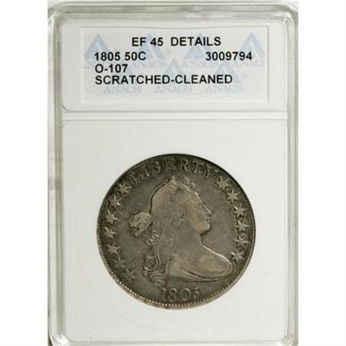 <B>1805 50C --Scratched, Cleaned--ANACS. XF45 Details.</B></I> O-107, R.5. A faintly hairlined, partly retoned representative of this rare die marriage, well struck overall with a touch of softness present at the upper right stars and clouds on the reverse. The golden-brown and cloud-gray surfaces show a number of fine scratches, including a thin one on Liberty's cheek.<BR><BR><B>Coin Engraver:</B> Robert Scot<BR><BR><b>Shipping:</b> Coins & Currency (<a target="_blank" href="http://www.heritageauctions.com/common/shipping.php">view shipping information</a>)