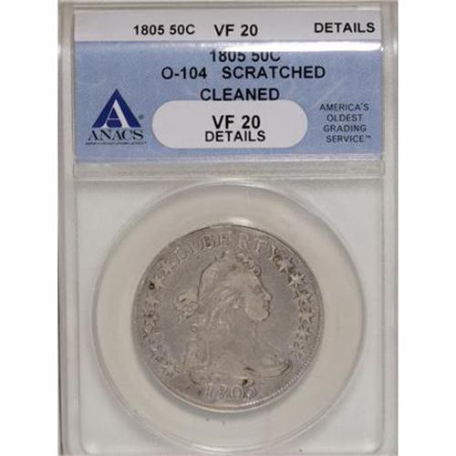 <B>1805 50C --Cleaned, Scratched--ANACS. VF20 Details.</B></I> O-104. NGC Census: (11/194). PCGS Population (26/203). Mintage: 211,722. Numismedia Wsl. Price for NGC/PCGS coin in VF20: $450. (#6069)<BR><BR><B>Coin Engraver:</B> Robert Scot<BR><BR><b>Shipping:</b> Coins & Currency (<a target="_blank" href="http://www.heritageauctions.com/common/shipping.php">view shipping information</a>)