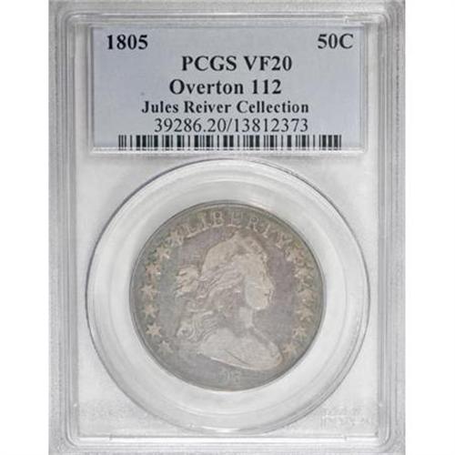 <B>1805 50C VF20 PCGS.</B></I> O-112a, R.2. Ex: Jules Reiver. Probably R.7 as a die state. There are two states of this advanced die state. The first shows the cud only over ES, and the second and more advanced shows the cud over TES. This coin was struck from the later state of the die, as the diagnostic circular die crack through STATES and the upper portion of the clouds has developed into a retained cud. The retained cud on the reverse is the cause for excessive weakness at the lower portion of the obverse, obliterating the 18 in the date. The late die state was not described by Overton. <BR> The surfaces display lavender, gold, blue, and gray toning, and are remarkably clean for a circulated coin.<BR> With so few examples known of the ‘a' die state, it is difficult to speak in terms of condition rarity. However, Herrman's listing of coins in auction and mail bid lists enumerates only three coins. They are graded: 45/45, 20/20, 20/20. <BR> Haseltine-11; Beistle 5-F; Overton-20; PCGS# 39286; Encyclopedia-4577.<BR><I>Ex: 1986 ANA Mid-Winter Auction (Heritage,2/1986), lot 2706; Jules Reiver Collection (Heritage, 1/2006), lot 22539.<BR>From The Westmoreland County Collection of Early Bust Halves, 1794-1807.</B></I><BR><BR><B>Coin Engraver:</B> Robert Scot<BR><BR><b>Shipping:</b> Coins & Currency (<a target="_blank" href="http://www.heritageauctions.com/common/shipping.php">view shipping information</a>)