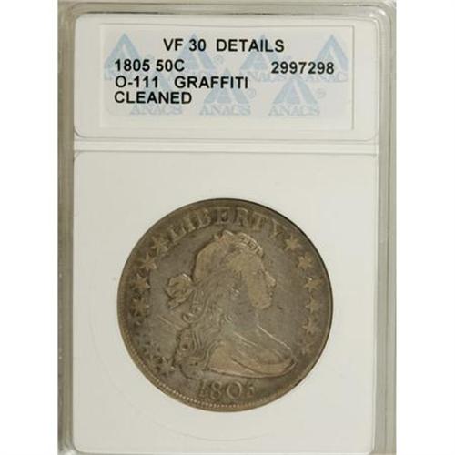<B>1805 50C --Cleaned, Graffiti--ANACS. VF30 Details. O-111.</B></I> NGC Census: (20/145). PCGS Population (28/137). Mintage: 211,722. Numismedia Wsl. Price for NGC/PCGS coin in VF30: $645. (#6069)<BR><BR><B>Coin Engraver:</B> Robert Scot<BR><BR><b>Shipping:</b> Coins & Currency (<a target="_blank" href="http://www.heritageauctions.com/common/shipping.php">view shipping information</a>)