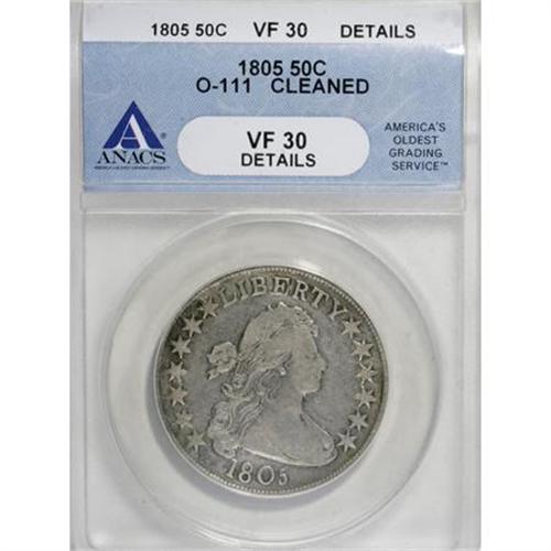 <B>1805 50C --Cleaned--ANACS VF30 Details.</B></I> O-111. NGC Census: (20/150). PCGS Population (29/143). Mintage: 211,722. Numismedia Wsl. Price for NGC/PCGS coin in VF30: $810. (#6069)<BR><BR><B>Coin Engraver:</B> Robert Scot<BR><BR><b>Shipping:</b> Coins & Currency (<a target="_blank" href="http://www.heritageauctions.com/common/shipping.php">view shipping information</a>)