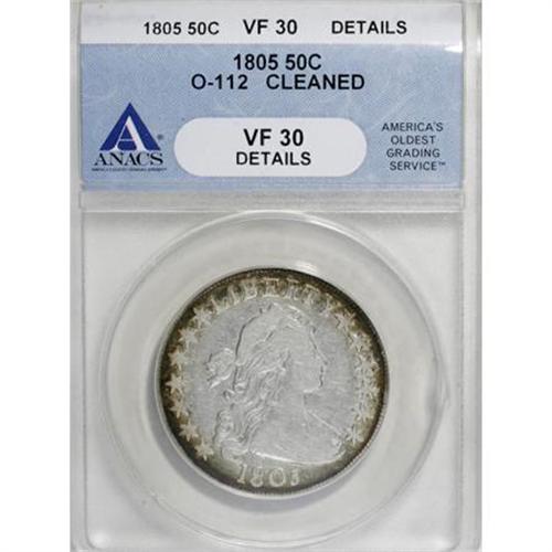 <B>1805 50C --Cleaned--ANACS. VF30 Details.</B></I> O-112. NGC Census: (20/150). PCGS Population (29/143). Mintage: 211,722. Numismedia Wsl. Price for NGC/PCGS coin in VF30: $780. (#6069)<BR><BR><B>Coin Engraver:</B> Robert Scot<BR><BR><b>Shipping:</b> Coins & Currency (<a target="_blank" href="http://www.heritageauctions.com/common/shipping.php">view shipping information</a>)