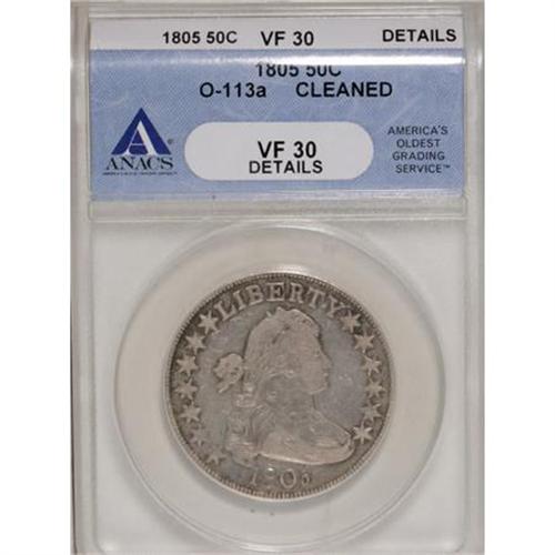 <B>1805 50C --Cleaned--ANACS. VF30 Details.</B></I> O-113a. NGC Census: (20/150). PCGS Population (30/144). Mintage: 211,722. Numismedia Wsl. Price for NGC/PCGS coin in VF30: $850. (#6069)<BR><BR><B>Coin Engraver:</B> Robert Scot<BR><BR><b>Shipping:</b> Coins & Currency (<a target="_blank" href="http://www.heritageauctions.com/common/shipping.php">view shipping information</a>)