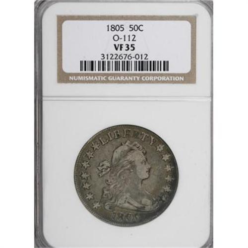 <B>1805 50C VF35 NGC.</B></I> O-112, R.2. The obverse is dusky lime and sun-gold, while the reverse features deeper russet-gray toning. A moderately circulated but problem-free example of this challenging silver type.<BR><I>From The John Stimson, Sr. Collection, Part Two.</B></I><BR><BR><B>Coin Engraver:</B> Robert Scot<BR><BR><b>Shipping:</b> Coins & Currency (<a target="_blank" href="http://www.heritageauctions.com/common/shipping.php">view shipping information</a>)