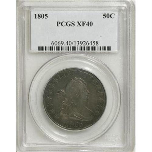 <B>1805 50C XF40 PCGS.</B></I> O-111, R.2. Pleasing surfaces with attractive grayish-brown and dark steel toning on both sides. The strike is somewhat weak toward the outer edges, especially evident along the right obverse and lower reverse.<BR><BR><B>Coin Engraver:</B> Robert Scot<BR><BR><b>Shipping:</b> Coins & Currency (<a target="_blank" href="http://www.heritageauctions.com/common/shipping.php">view shipping information</a>)