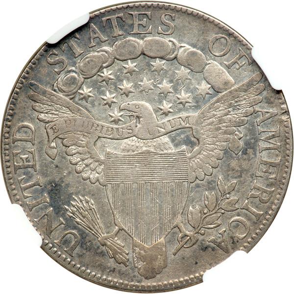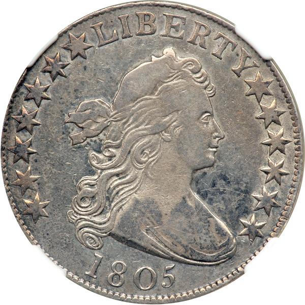 1805 Draped Bust Half Dollar. . Overton-106, Rarity-3. NGC graded VF-25. Nice light golden toning. 211,722 minted. Half dollars were not struck in 1804, but there is an 1805/4 overdate in the variety group this year presumably intended for use in that year but overpunched with a 5 when no orders came in for half dollars.