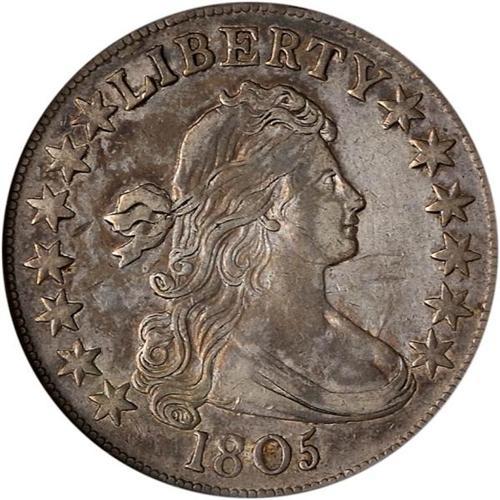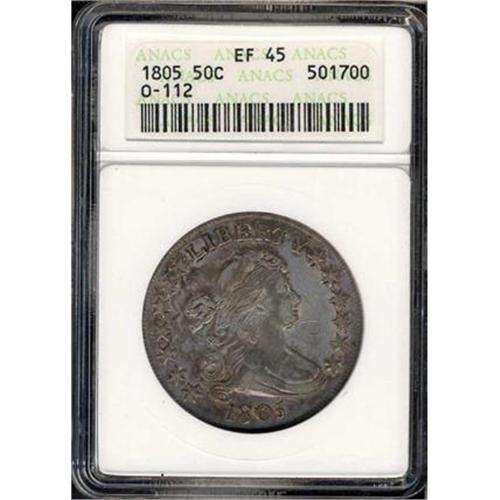 <b>1805 Draped Bust Half Dollar. O-112. ANACS graded EF45.</b> A few light marks on the face and shoulder area. Cleaned and recolored with uneven gray to russet brown on the obverse, more or less the same distribution of hues on the sharply struck reverse. Not the finest one seen, but acceptable as an EF for a Type set collection. There is a long die crack through STATES <b>(PCGS # 6069)</b>