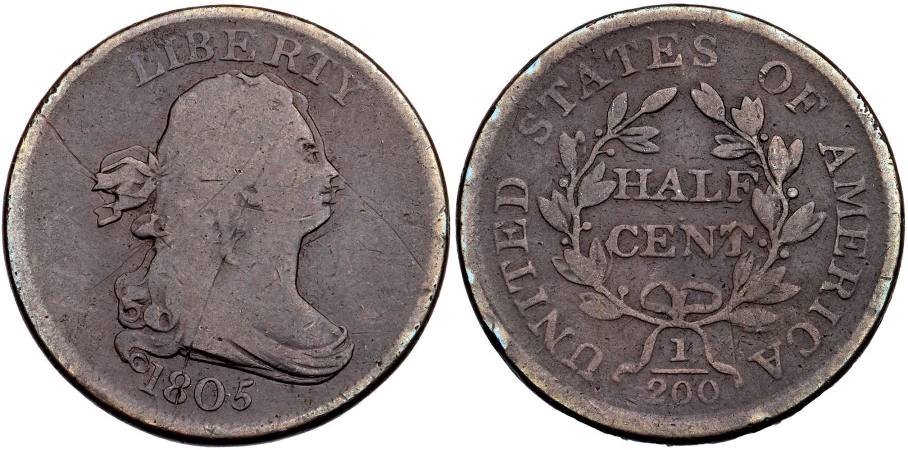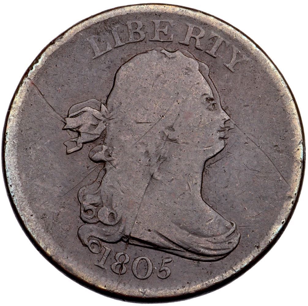 1805 C-1 R-2- Small 5 Stemless G4A point or two sharper but there are old scratches on both sides. The most notable include one before the nose, one from the ear to the shoulder, one behind the hair braid, a small one on T in CENT, and another through the lower right wreath. There is also a tiny rim bruise at NI in UNITED. Double struck on the obverse, the first strike rotated CCW a few degrees most obvious around the profile. Bold date and legends with fairly smooth surfaces. Certificate Number: Pedigree: Ex; Don Valenziano - R. Tettenhorrst 9/2015 - Bob Kebler Collection