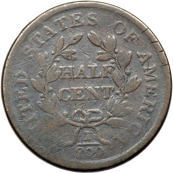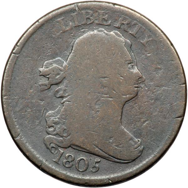 1805 C-1 R2- Stemless Wreath G5. Double Struck with Minor Rotation, Reverse Brockage Maker. Very slightly sharper but there are too many small contact marks for the higher grade. Two identifying marks are a thin rim nick at IB in LIBERTY and a short scratch under EN in CENT. Glossy chocolate brown and steel. The date is strong and the legends are clear except for weakness at UN in UNITED. Double struck with a small rotation between impressions, perhaps a half millimeter. The doubling is obvious along the profile and hair ribbons, but there is no trace of doubling on the reverse. Instead, that side displays the usual swelling associated with having been struck against a new blank planchet, thereby creating a reverse brockage. In fact, it's the swelling that caused UN to be weak. The repunching at the top of the 5 remains clear and the stemless wreath feature is visible. Davy #05.1.16.