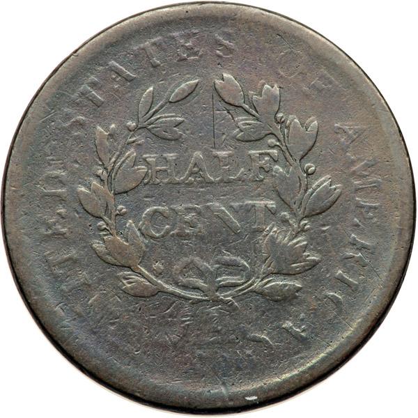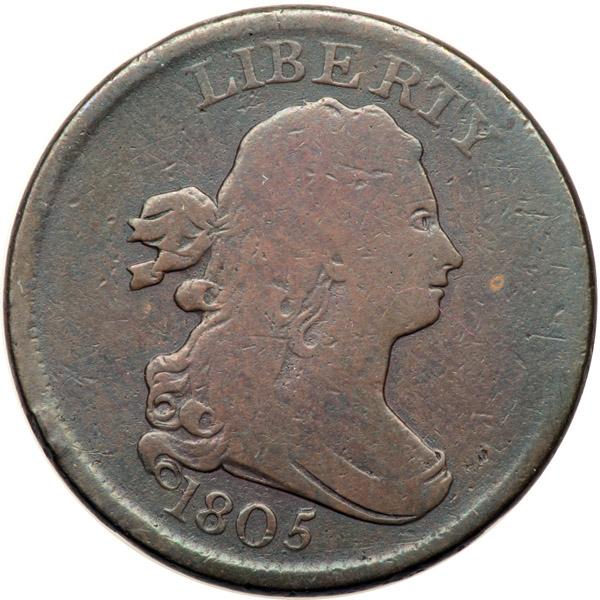 1805 C-1 R2- Stemless Wreath G5. Double Struck Reverse. Very slightly sharper but this piece was lightly cleaned and recolored an attractive glossy chocolate and steel brown. The surfaces are smooth without any hint of corrosion or verdigris. The notable marks are a small pinprick in the field above the bust tip and a fine vertical hairline scratch over the L in HALF. The reverse is clearly double struck with an offset of about a half millimeter between impressions, clearest on the wreath. The obverse, however, displays no trace of doubling. While it is possible the obverse was struck against a new blank planchet during the second strike, there is no hint of swelling that is evidence of being a brockage maker. One possibility is that the obverse stuck to the die and the coin was struck a second time by both dies without any shift between strikes on the obverse side. Another option is that this is a dramatic example of a chatter strike error (caused by die bounce or operator error). The repunching above the 5 remains sharp and the stemless wreath feature is obvious. Davy #05.1.15.