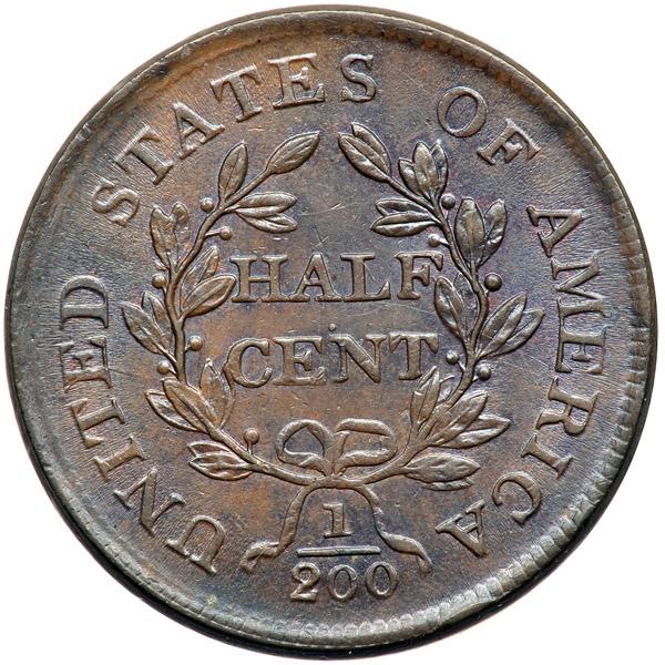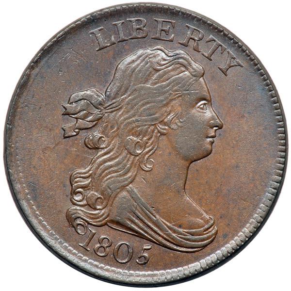 1805 C-1 R2- Stemless Wreath. PCGS graded MS-63 Brown. Lustrous bluish steel and chocolate brown blending into olive with smooth, satiny surfaces. This piece offers excellent eye appeal. The only defects are a short, light scuff that barely breaks the satiny luster under the lower ribbon tip behind the head and a couple barely visible hairlines under ER in AMERICA. MDS, Manley state 1.0 late, with the reverse rotated 15 degrees CW. A small but clearly defined rim cud right of the fraction covers 4 dentils. An attractive example, at the lower end of the condition census. Our grade is MS60. The attribution and Davy provenance are noted on the PCGS label. Comes with a nice provenance. Davy #05.1.3.