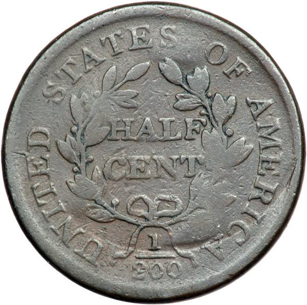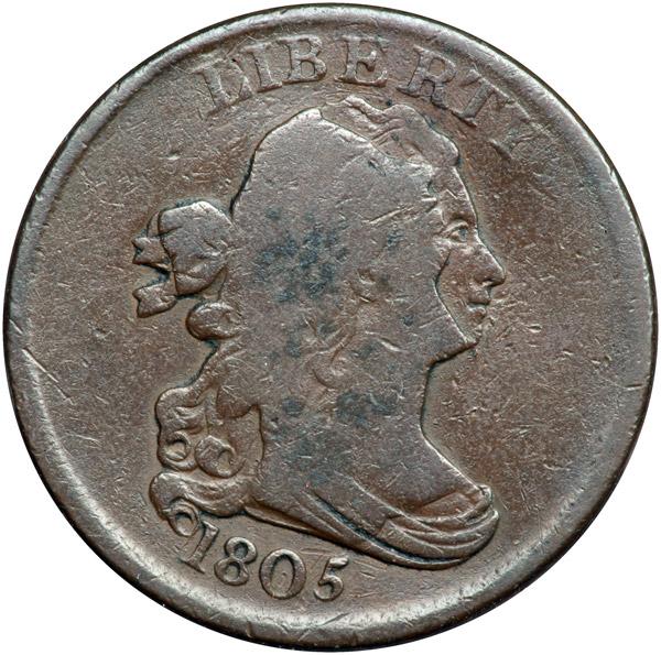 1805 C-1 R2- Stemless Wreath VG8. Double Struck with Rotation/Reverse Brockage Maker. Glossy chocolate and steel with specks of darker steel brown toning on the portrait. Smooth and attractive for the grade, void of any notable defects. Double struck with a rotation of 30 degrees between impressions. Ms Liberty has two clear faces, one normal and one looking at RT in LIBERTY. The reverse is not doubled. Instead it was pressed into a 20% off center blank planchet creating an off center reverse brockage. The blank planchet left an arcing depression through the bottom of the reverse even with the fraction bar, and that tells us the brockage was off center. Seems to be a "common" type of mint error for this variety, and this one is very nice for the grade. Davy #05.1.11.