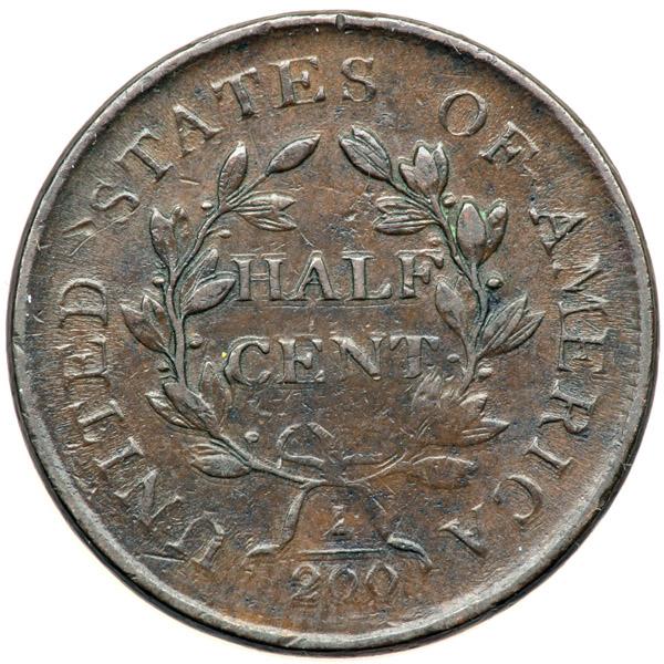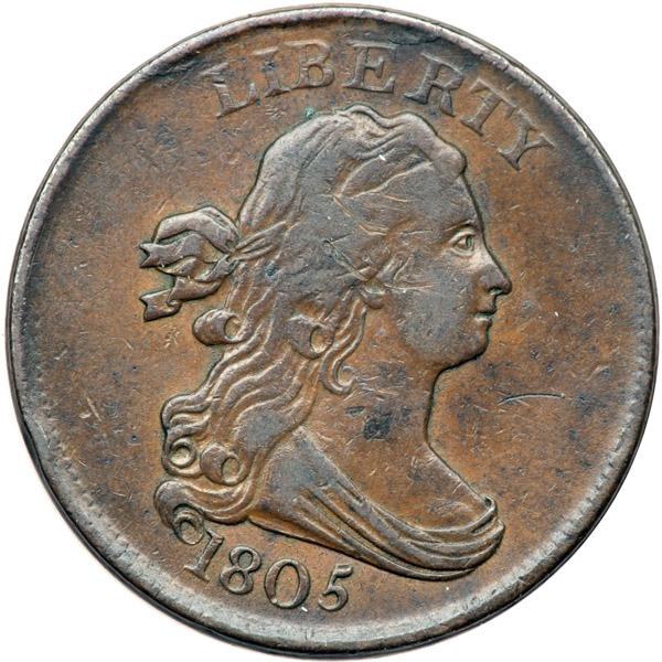 1805 C-1 R2- VF20. Double Struck Reverse. Slightly sharper with a couple short scratches on the cheek and in the hair to the left. Glossy chocolate brown with frosty lighter brown toning in protected areas and a few small puffs of darker olive and steel toning on the obverse. LDS, Manley state 2.0. The reverse is clearly double struck but the obverse shows no trace of doubling. The offset between impressions on the reverse is very small, perhaps a half millimeter. Nonetheless, the doubling is sharp and clearly visible on the entire wreath and HALF CENT with minor doubling visible on the legend outside the wreath.