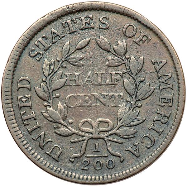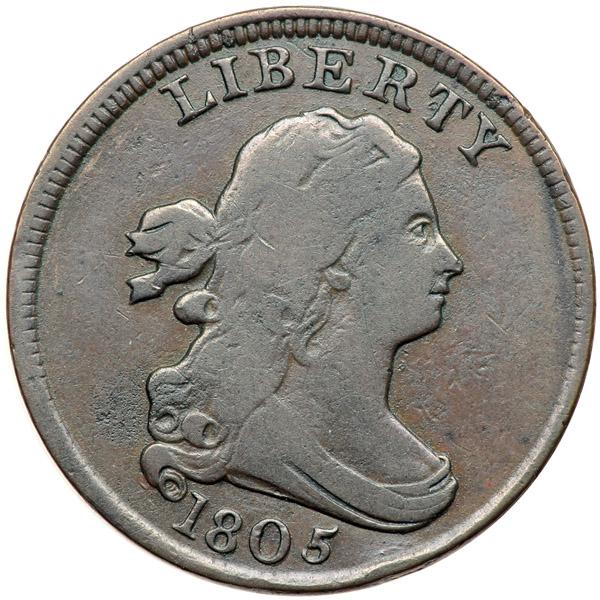 1805 C-2 R5 Small 5 with Stems VG8. A couple points sharper but there is a rim bruise under the bust tip. The planchet is mostly smooth and glossy with very attractive medium chocolate toning throughout. Excellent eye appeal for the grade, but there are traces of microscopic porosity on the upper part of the reverse. The roughness is visible only under magnification and the majority of the planchet is smooth. The fields on the obverse are hard and slightly reflective offering outstanding eye appeal for the grade. Nicely struck with HALF CENT complete and clear. The swelling in the field before the portrait is just starting to show, but it is quite subtle. The reverse is rotated 15 degrees CCW. An important example of this very rare variety. Called CC#6 in the Mike Spurlock census, #8 in the Frank Wilkinson list. Noyes photo #73657. Weight 83.9 grains.