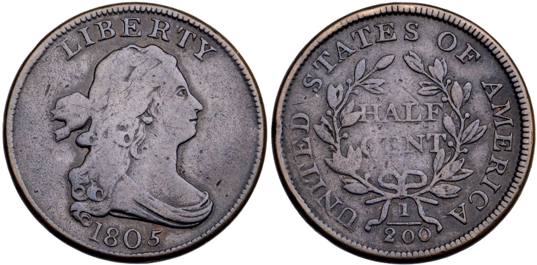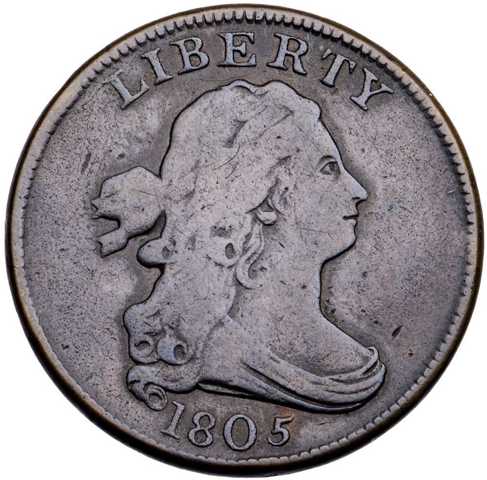 1805 C-3 R-4 Small 5 Stems F12Mostly glossy olive and steel brown. The only marks are a small nick over the upper end of the hair ribbon and light rim bruises at NI and D in UNITED. The date and legends are strong. Not perfect but still quite nice for the grade. LDS, Manley state 2.0 with strong obverse swelling.Certificate Number: Pedigree: Ex; EAC 4/2007:56 - Col. Steve Ellsworth Collection HA 5/20081691 - Bob Kebler Collection