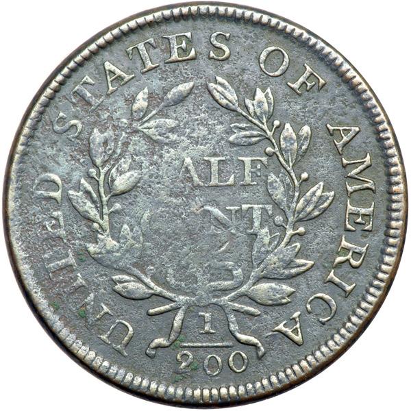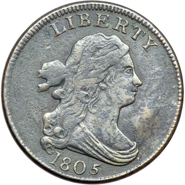 1805 C-3 R4 Small 5 with Stems F12. Sharpness VF30 but lightly corroded. No marks, and the only verdigris is few tiny specks at the T in LIBERTY and the 2 in the denominator. Rather glossy olive and dark steel with lighter steel highpoints. LDS, Manley state 2.0, showing heavy swelling in the field before the portrait. Sharply struck except for the H in HALF and CE in CENT, which are softly impressed, as usual. Not perfect, but still a decent example of this popular "Redbook" variety.