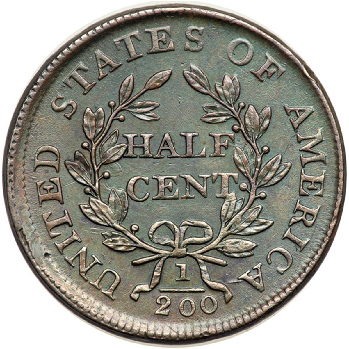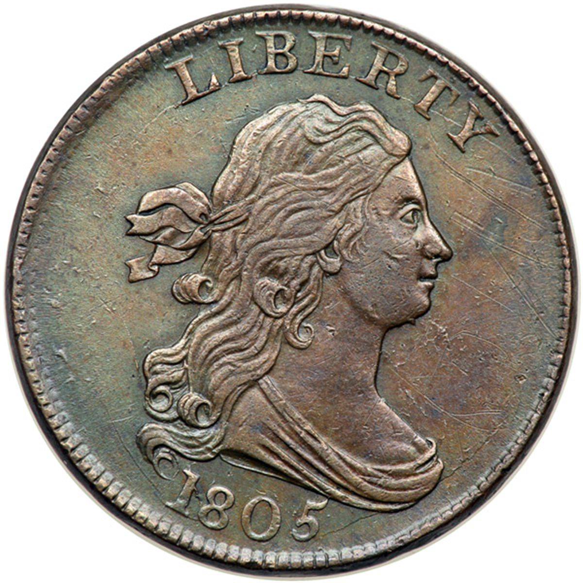 1805 C-4 R2 Large 5 EF45. Sharpness near mint state but this piece was lightly cleaned and retoned frosty light olive and chocolate with overtones of sea-green. The only marks are some fine scratches in the field before the face and a few more hidden in the hair right of the ribbon. Sharply struck LDS, Manley state 2.0, with a fine but clear die crack extending through the bust tip.