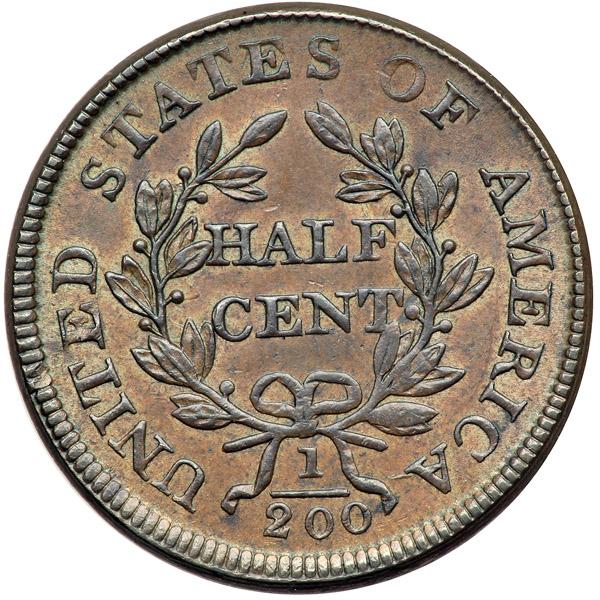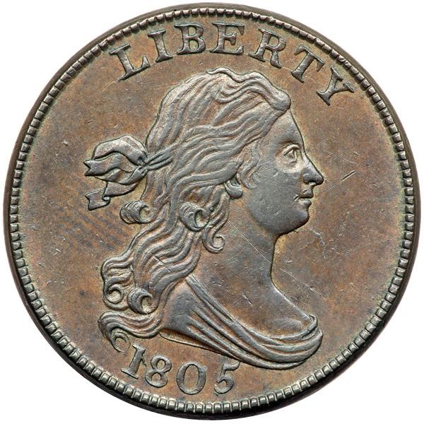1805 C-4 R2- Large 5 with Stems AU50+. Sharpness very close to mint state but there is a faint hairline scratch across the upper part of the neck from under the earlobe into the field above the bust where it fades out. Otherwise the surfaces are choice with only a few trivial contact marks of no significance and only a hint of rub on the highpoints. A shallow planchet void from the top of the E in UNITED to the dentils above the right side of the adjacent T (as struck) is a good identifying mark. Lustrous medium brown with chocolate toning on the highpoints and frosty tan faded down from mint color in the protected areas. EDS, Manley state 1.0, before the die crack from the 5 to the bust tip and beyond. The obverse is perfectly centered on the planchet but the reverse is slightly misaligned to K-1. The reverse is rotated 10 degrees CW. Listed as tied for CC#6 in the Mike Spurlock census, CC#3 in the Jim McGuigan list. Breen lists this piece as #2 in his half cent encyclopedia and it finished in second place in the 2005 Half Cent Happening event held at the EAC Convention that year. Obviously this is one of the better examples of the Large 5 variety. Noyes photo #74114. Weight 84.3 grains.
