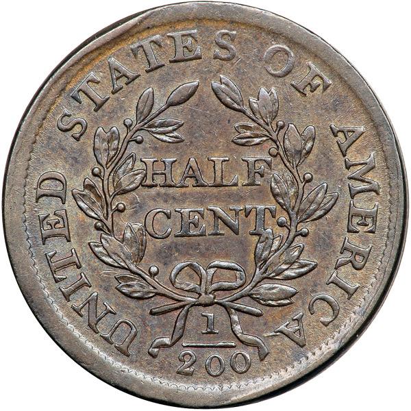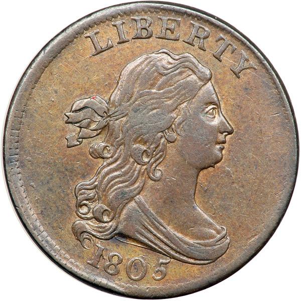 1805 C-4 R2- Large 5 with Stems EF40. Glossy chocolate brown with lots of frosty lighter steel brown and golden tan faded down from mint color covering the protected areas on both sides. A spot of darker toning at the shoulder above the 18 is the only notable mark. MDS, Manley state 2.0 early. The die crack through the bust tip is faint.