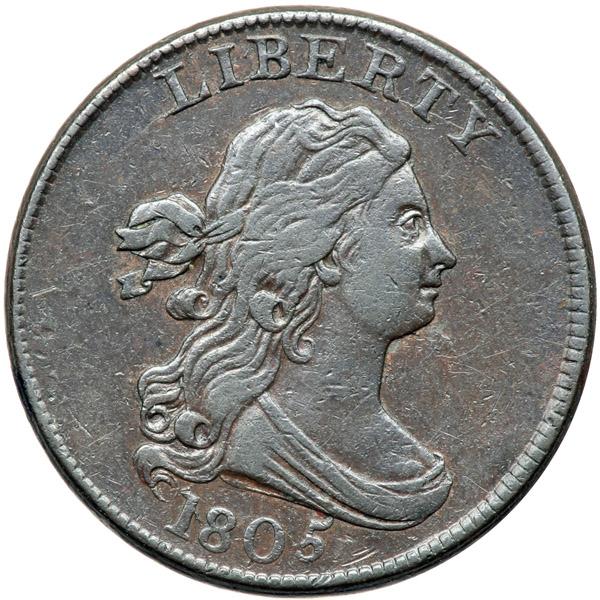 1805 C-4 R2- Large 5 with Stems VF35. Slightly sharper with a few too many tiny contact marks for the higher grade. None of the marks is significant or distracting and this piece offers excellent eye appeal. Glossy dark steel and olive brown with frosty lighter steel brown mixed with hints of very faded mint color in protected areas. EDS, Manley state 1.0.
