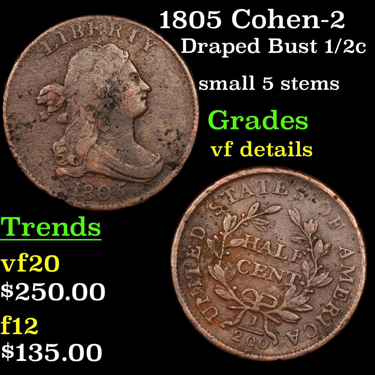 1805 Cohen-2 Draped Bust Half Cent 1/2c Grades vf details.