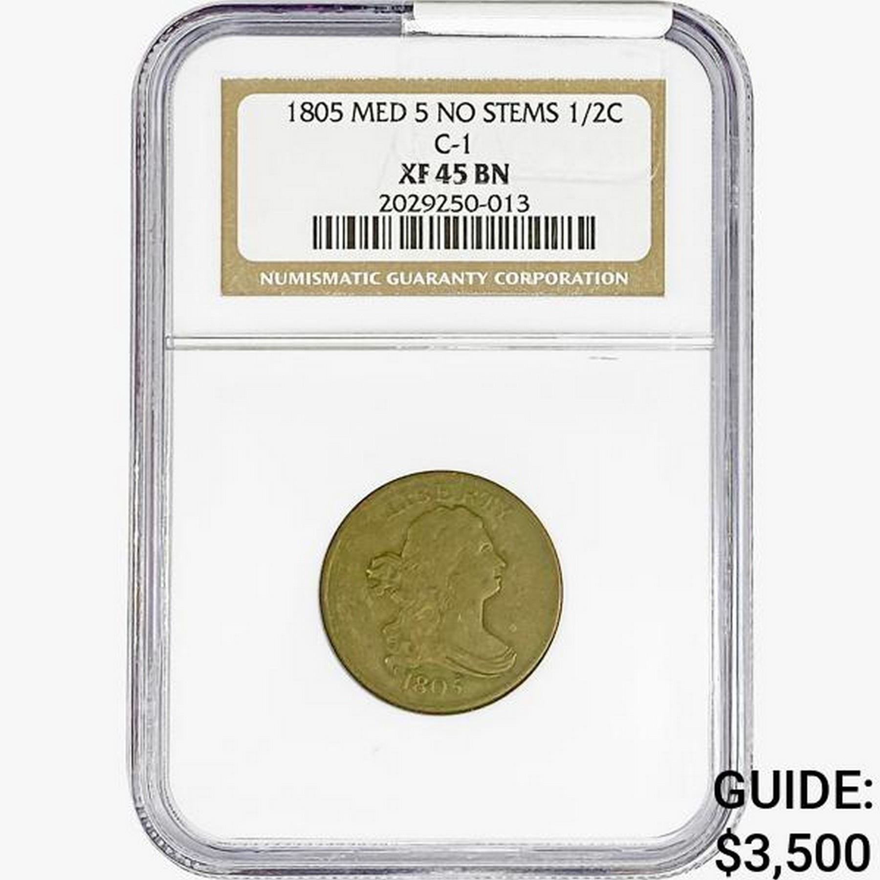 1805 Draped Bust Half Cent NGC XF45 BN MED 5 No Stems