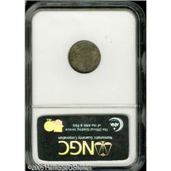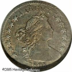 <B>1805 H10C AU55 NGC.</B></I> Ex: Eliasberg / Price. V-1, LM-1, R.4. Only one die marriage is known for this rare, early half dime, representing 75-100 examples, most of which are VF or less. This is one of the finest pieces known and has represented this date in two of the finest collections formed in the last hundred years. The 1805 is generally considered the second scarcest issue of this short-lived type, and is similar in rarity to the 1801. One of the striking characteristics of the 1805 is that localized weakness is seen on all specimens. On this coin, the bust is completely flat and the O in OF is not visible. The gray-rose surfaces show a darker patch of color on the left side of the obverse, and there are a few light abrasions noted on each side. Of the 1805 half dimes that have been certified, only six have been graded higher than this piece, and only one is better than AU58.<BR><I>Ex: Eliasberg I (Bowers and Merena, 5/96), lot 907, where it brought $10,780.</B></I> Lot:6104