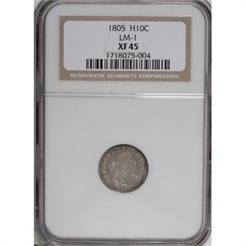 <B>1805 H10C XF45 NGC.</B></I> V-1, LM-1, R.4. The only variety for the year. The 1805 half dime is a very scarce issue across all grades, and in better states of preservation, it is a condition rarity. This still-lustrous example, silver-gray and slate-gray with elements of gold and violet in the fields, shows a degree of softness on the devices, but the overall visual appeal is excellent. Census: 2 in 45, 5 finer (12/07).<BR><BR><B>Coin Engraver:</B> Robert Scot<BR><BR><b>Shipping:</b> Coins & Currency (<a target="_blank" href="http://www.heritageauctions.com/common/shipping.php">view shipping information</a>)