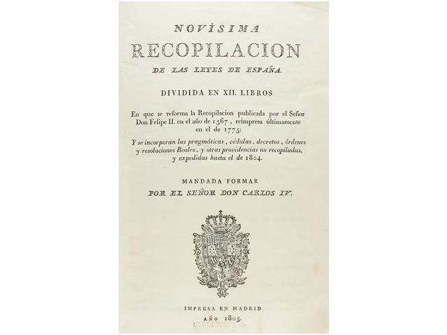 1805. LIBRO: (1ª EDICION-HISTORIA ESPAÑA). CARLOS IV: NOVISIMA RECOPILACION DE LAS LEYES DE ESPAÑA. Dividida en XII libros. En que se reforma la Recopilación publicada por el Señor Don Felipe II, en el año de 1567, reimpresa últimamente en el de 1775: Y se incorporan las pragmáticas, cédulas, decretos, órdenes y resoluciones Reales, y otras providencias no recopiladas, y explicadas hasta el de 1804 / Mandada formar por el Señor Don Carlos IV. Impreso en Madrid, 1805. 5 tomos encuadernados en 3 Volúmenes en folio: Vol. I (Tomo 1º, Libros I y II. Tomo 2º, Libros III, IV y V); Vol. II (Tomo 3º, Libros VI y VII); Vol. III (Tomo 4º, Libros VIII y IX. Tomo 5º, Libros X, XI y XII), paginación: (2 h., VIII folios, XXVI p., 6 h., 338 p. = 3 h., 492 p.; 3 h., 278 p., 451 p.; 2 h., 400 p. = 3 h., 530 p.). Escudo grabado en la portada (el tomo 1º es el único que lleva portada, los siguientes se editaron empezando una hoja con el título de la obra y el Nº de tomo). Texto a dos columnas. Encuadernados en pergamino época. Palau, 195750. Fundamental recopilación legislativa, encargada por el rey en 1799 a Juan de la Reguera, de la Cancillería de Granada, quien reunió todas las leyes vigentes en España, corrigiendo errores o repeticiones, y formando así un cuerpo legislativo de derecho, indispensable para el buen gobierno y recta administración de los reinos de España en todos los campos: administración política y local, derecho penal, derecho civil, leyes culturales, sobre ciencias, artes u oficios, deberes para con la hacienda pública, contratos y obligaciones, testamentos, etc. La obra contiene un último volumen con un índice por orden alfabético, otro cronológico y un tercero por materias.