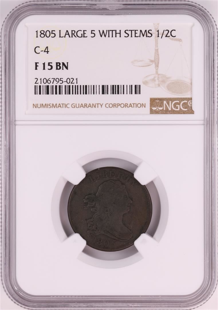 One 1805 Large 5 With Stems C-4 Draped Bust Half Cent Coin NGC F15 BN. NGC Certified.