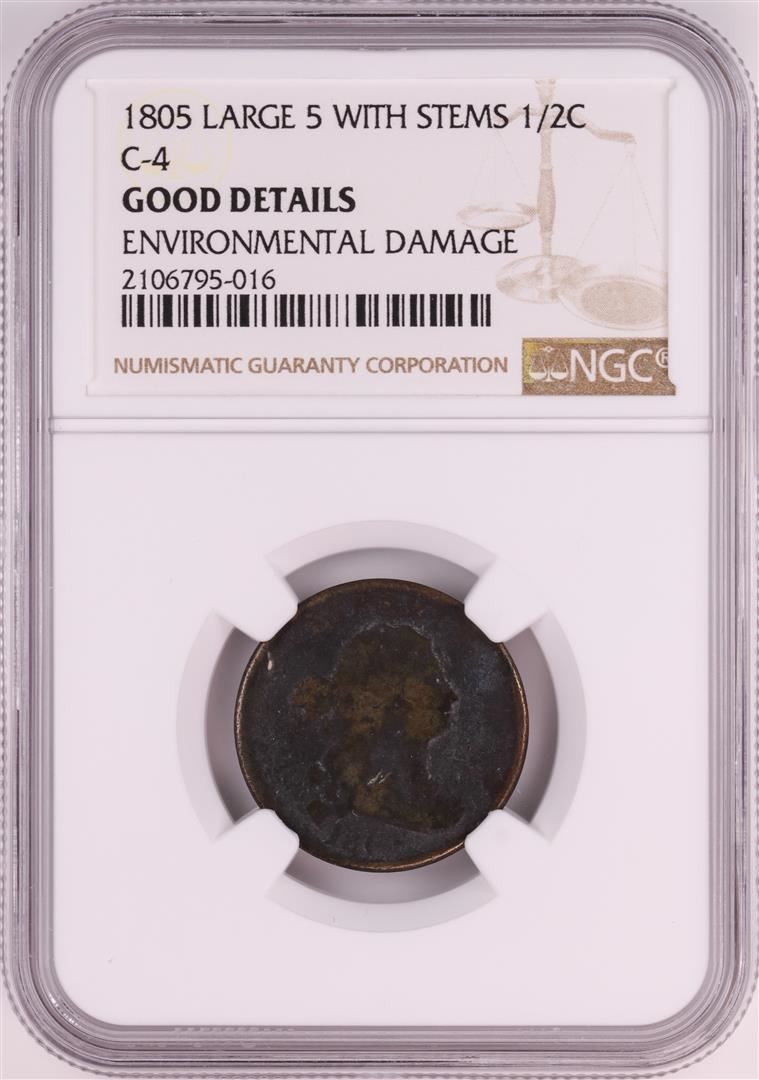 One 1805 Large 5 With Stems C-4 Draped Bust Half Cent Coin NGC Good Details. NGC Certified.