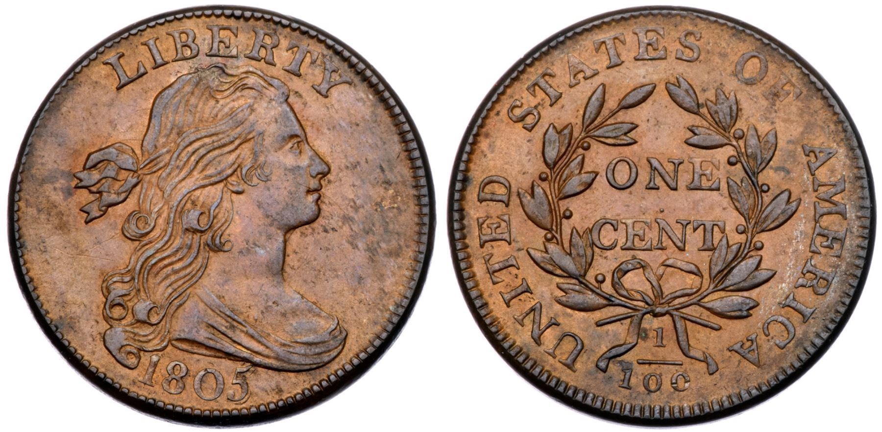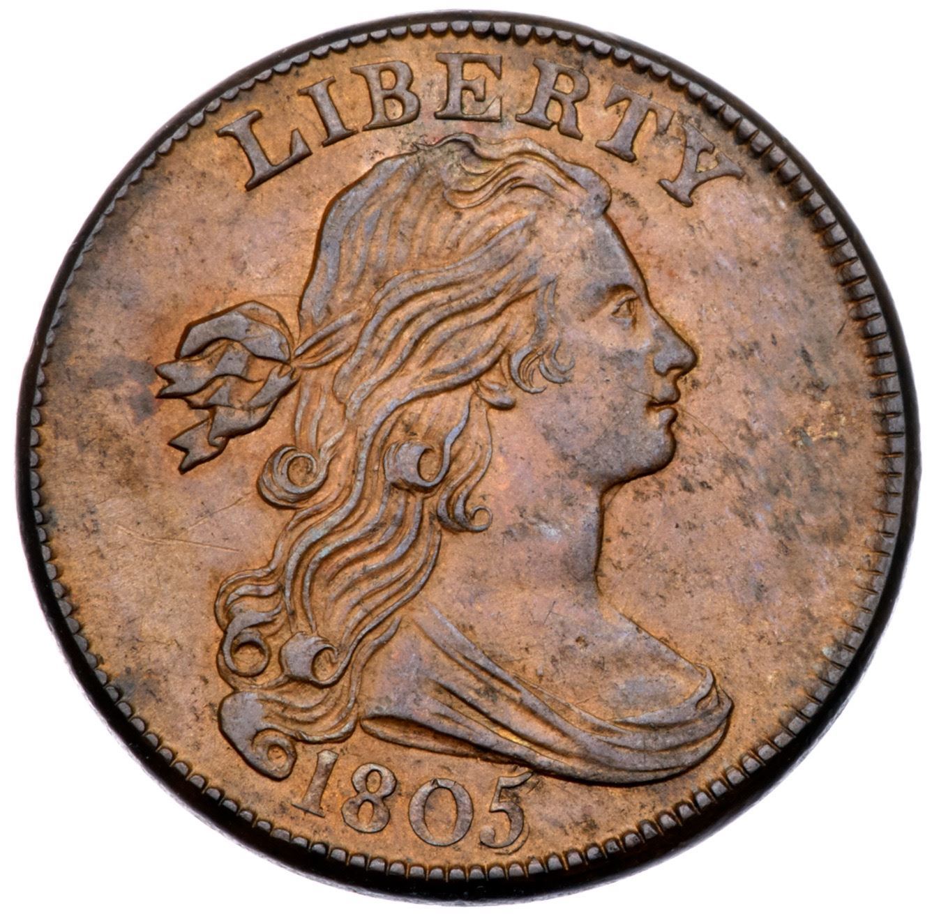 1805 S-267 R-1 EF45Slightly sharper with smooth surfaces and nice eye appeal, but there is a light scratch in the field below the hair ribbon and another from the lips into the field. Glossy tan with steel brown toning on the highpoints and in the field before the portrait. Sharply struck E-MDS, Breen state II, with die clashmarks on both sides and smooth, hard fields. Graded EF45 by Del Bland. Noyes says AU50 net EF45 and tied for CC#17, his photo #31945.Certificate Number: Pedigree: Ex Gordon J. Wrubel, Bowers & Ruddy 2/1977:41-Steve Ivy-Roger S. Cohen, Jr., Superior 2/2/1992:101-Fred H. Borcherdt Collection