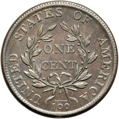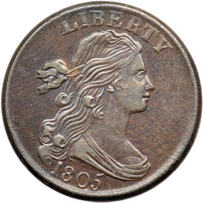 1805 S-268 R3. AU-50. Plated in Breen and Noyes. Glossy chocolate and steel brown. The surfaces are perfectly smooth and quite attractive. The only marks are a short, light pinscratch near the dentils right of the date and a faint diagonal hairline scratch on the cheek. Otherwise this cent is flawless. MDS, Breen die state II, with faint die clashmarks at the throat but no die swelling on either side. This is the plate coin for the variety in the Breen and Noyes books on the series. Called AU50 net EF45 and finest known in the Noyes census, his photo #23075. Bland says AU50 and finest known by a full 10 points. This cent comes with a typed envelope from C. Douglas Smith where he states "Finest known by a goodly margin." Looks like his assessment has held up over the years. DWH #3516.
