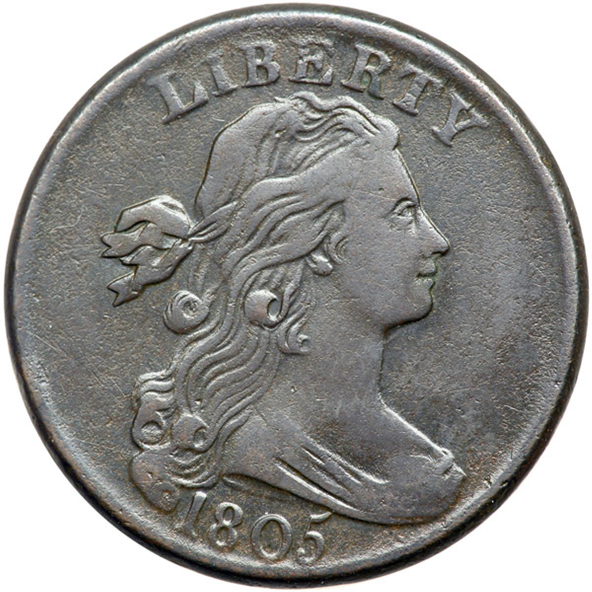 1805 S-268 R3 VF20. Sharper by at least 5 points but the surfaces are slightly dull due to underlying extremely faint roughness that is only visible under strong magnification. There are traces of crud dusted into the most-protected areas on the reverse. The only contact marks are two small nicks under the A in STATES. Partially glossy dark steel and olive brown with underlying frosty luster showing through in the fields and protected areas, especially on the reverse. A decent example of a variety that is difficult to find in higher grades.