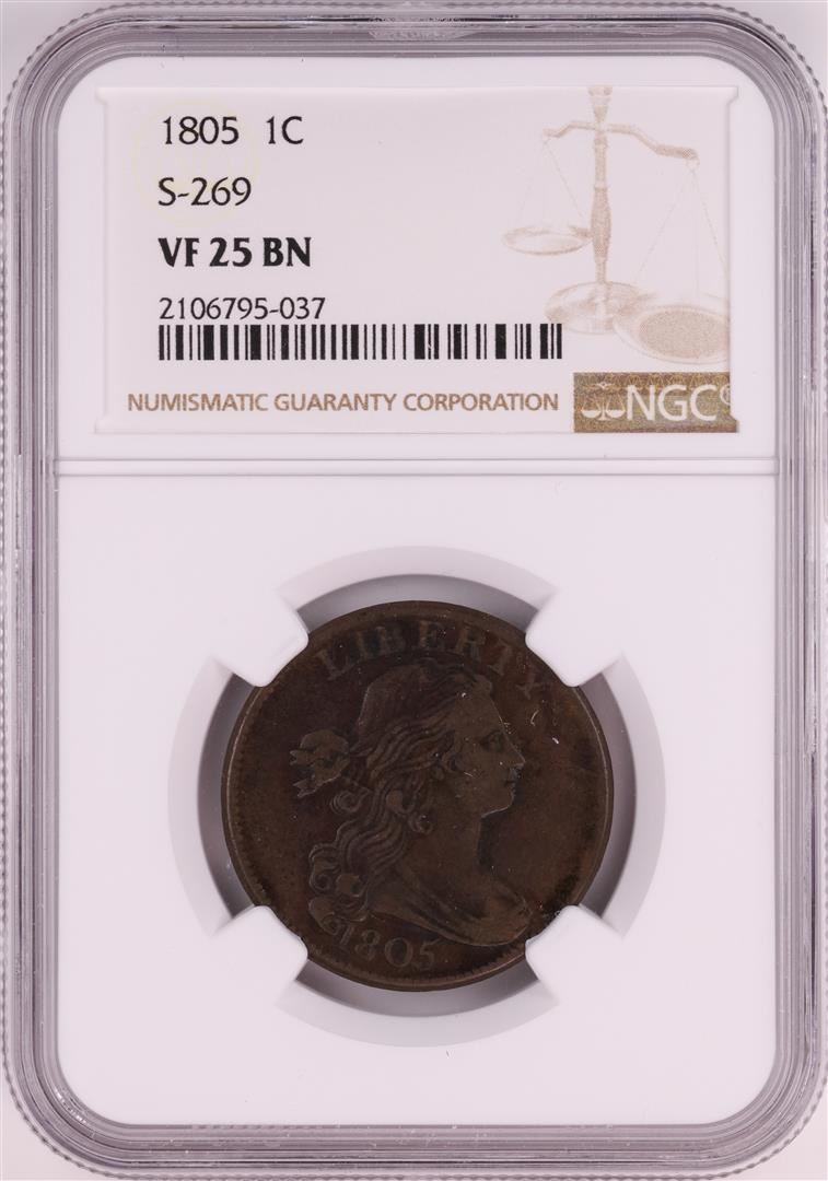 One 1805 S-269 Draped Bust Large Cent Coin NGC VF25 BN. NGC Certified.