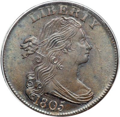 1805 S-269 R1 Pointed 1. PCGS graded MS-66 Brown. Plated in Penny Whimsy and Noyes. Highly lustrous bluish steel brown with peeps of faded mint red showing in some of the protected areas of the reverse. The satiny mint frost covers even the highest points of the design on both sides, and the eye appeal of this cent is outstanding. The only defects, and they are barely visible with a glass, are some tiny specks of dark toning in the field over the hair ribbon and another at the left top of the 8 in the date. The dentils are incomplete under the 0 in the date and at the opposing ones at the O in OF thanks to a very tiny planchet clip, as struck. M-LDS, Breen state IV, with a faint die crack through the base of the 180 in the date and a dull bulge in the field left of the lowest curl. Called MS65 "gem" and finest known in the Noyes census. Bland says MS61 and CC#1 as well. Although the census takers disagree on the exact grade of this cent, they do agree this is the only mint state example of the variety. Our grade is MS65. This is the plate coin for the variety in Penny Whimsy and the Noyes book, his photo #20647. PCGS Population 1; The finest graded at PCGS for the variety. DWH #2830.
