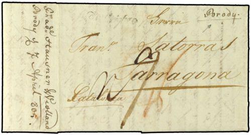 1805 TULEZYN (Ucrania) a TARRAGONA (España). Encaminador manuscrito al dorso "Hausner, Violland Brody" y en el frente támbien manuscrito "Brody". Tasada a la llegada con "9 reales".