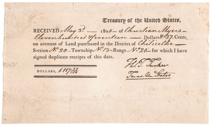 May 3, 1805-Dated, Extremely Rare and unusual Partly-Printed Document Signed, “Th. T. Tucker - Treas. Uni. States", 1 page, measuring about 6.5” x 4.25”, (Washington), Choice Very Fine. Being a Receipt form for $1,117.37 paid for a specific tract of Land purchased in "the District of Chilicothe" (likely Ohio). A most unusual and rare form, which we have not previously encountered, that is boldly printed on laid period paper and beautifully signed in rich deep brown, “Th. T. Tucker - Treas. Uni. States".