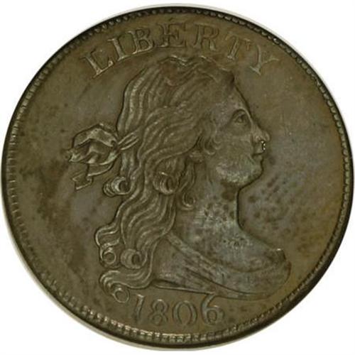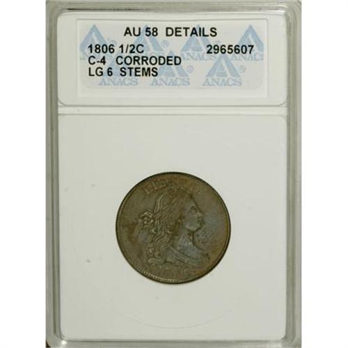<B>1806 1/2 C Large 6, Stems--Corroded--ANACS. AU58 Details.</B></I> C-4. NGC Census: (0/0). PCGS Population (15/25). Numismedia Wsl. Price for NGC/PCGS coin in AU58: $675. (#1099)<BR><BR><B>Coin Engraver:</B> Robert Scot<BR><BR><b>Shipping:</b> Coins & Currency (<a target="_blank" href="http://www.heritageauctions.com/common/shipping.php">view shipping information</a>)