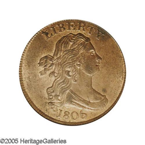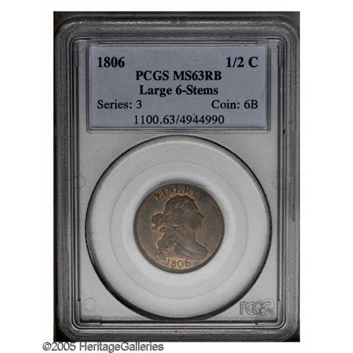 1806 1/2 C Large 6, Stems MS63 Red and Brown PCGS. B- 1806[1/2 C] Large 6, Stems MS63 Red and Brown