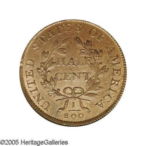 <B>1806<1/2 C> Large 6, Stems MS63 Red and Brown PCGS.</B></I> B-4, C-4, R.1. Immediately distinguishable by a large, repunched 6 with the peak affixed to the base of Liberty's bust. Much faded golden-tan color adheres to the devices. The strike is generally well executed, although the TES in STATES and a few leaves on the wreath are typically lacking in detail. Most Uncirculated representatives of this variety trace back to the hoard of 1806 B-4 Half Cents that the Chapman brothers dispersed in 1906.